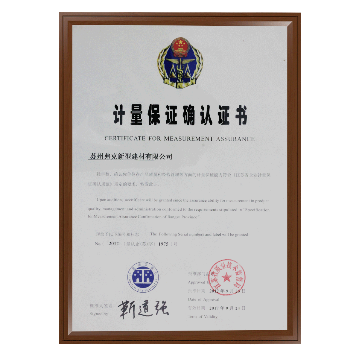 計(jì)量保證確認(rèn)證書(shū)